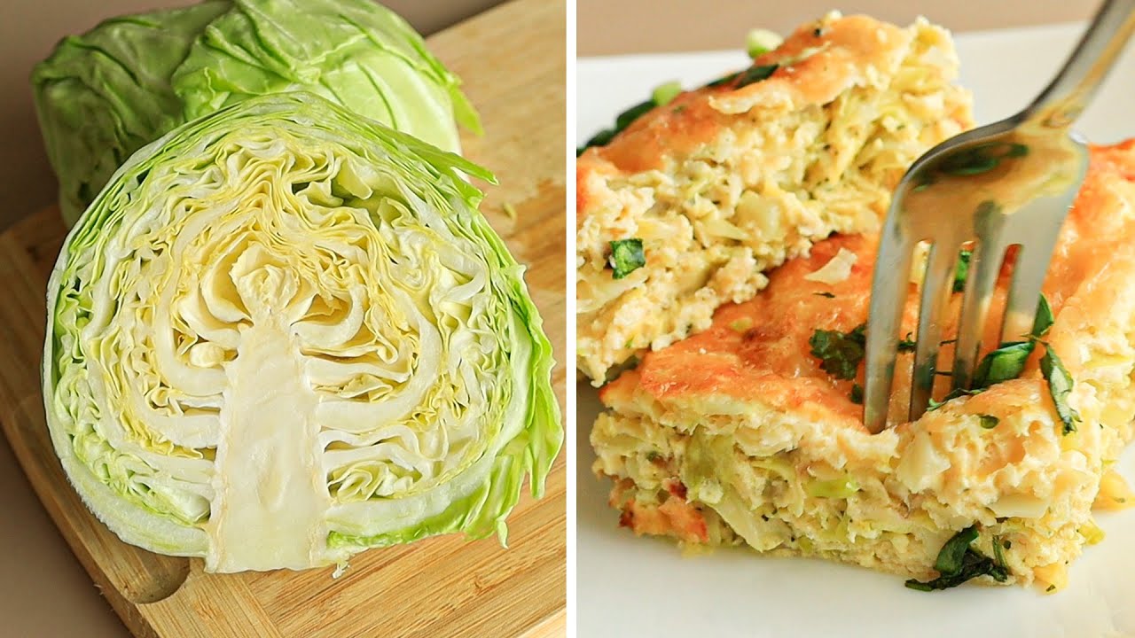 Капустина, 2 яйця, 2 ст. л. борошна, 60 мл олії, 50 г твердого сиру, сіль. Для начинки 1: цибулина, 400 г печериць, ст. л. сметани, сіль, перець. Для начинки 2: 4 яйця, 2 цибулини, сіль, перець.