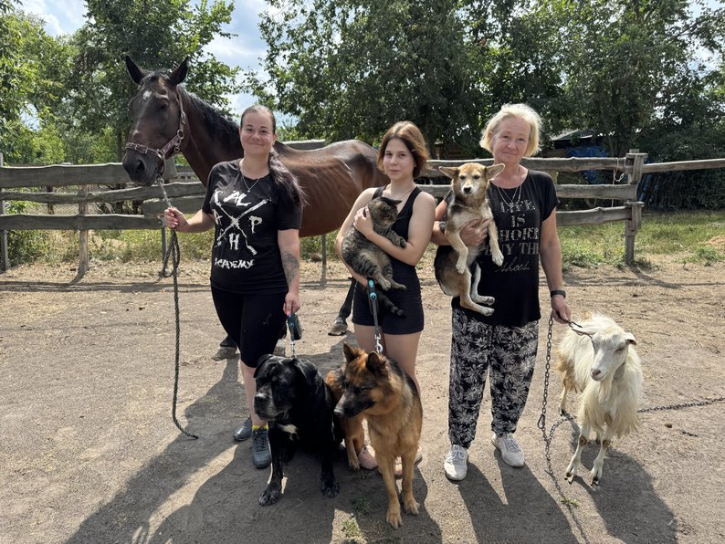 Анастасія Клімнюк з донькою Ксенією та мамою Оленою разом із тваринами з притулку. Суспільне Полтава