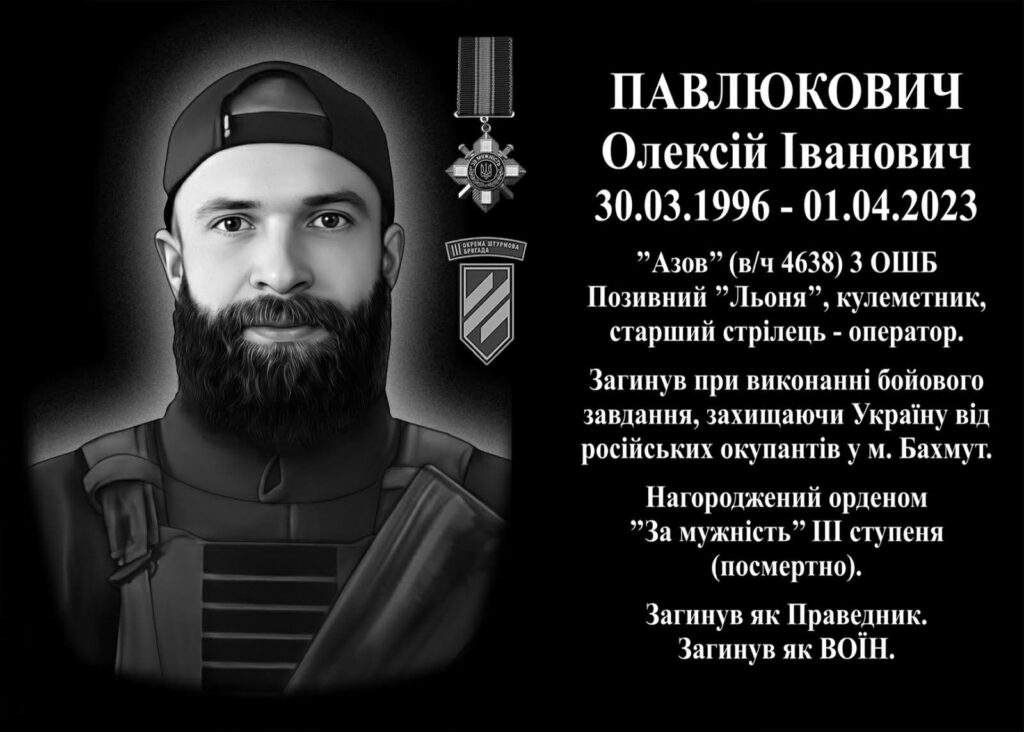 Телефон мовчав. Зрадливо і приречено. Рейд несамовито завивав й зазирав у очі. Заспокоювали собаку. Гнали від себе погані припущення.«Нас сповістили 5 квітня, – напівшепотом, напівстогоном веде далі мама. – Хоча, як з’ясувалося, в нашому Дніпровському морзі він був уже 2 квітня. На впізнанні попросила показати ногу. На ній був Рейд. «Не відкриємо обличчя, не варто, на голову припав весь удар, – співчували лікарі. – А ви запам’ятайте його таким, як був». …Хоронили нашого Альошу 11 квітня. Бо чекали з-за кордону сестер, ті з початком війни виїхали з дітьми. Так багато було побратимів на прощанні. Вони стільки розповідали про сина, відважного оборонця з позивним «Льоня». Та ми тоді нічого не розуміли. Це вже згодом хлопці, приїжджаючи, нам порозповідали такого, що сповнює гордістю, хоч дуже нестерпно болить. А ще писали. Як реліквію зберігаєм ті дописи. «Утримував одну з позицій у районі стадіону «Авангард», – йдеться в одному з них. – Вогнем кулемета стримував просування противника, а при переході до ближнього бою знищував ворожу піхоту гранатами. Після евакуації пораненого командира групи взяв командування на себе. Навіть після отримання контузії продовжував виконувати свої обов’язки кулеметника та командира». «1 квітня 2023 року під час виникнення загрози тактичного оточення долучився до евакуації поранених, – в наступному. – Під час переміщення групи прикривав її відхід. Під постійним стрілецьким вогнем загін дістався району залізничного вокзалу, де біля тунелю потрапив під шквальний вогонь ворожої артилерії та мінометів. Зазнавши уламкових поранень, Олексій загинув миттєво». «Павлюковича Олексія Івановича нагороджено орденом «За мужність» III ступеня (посмертно) та орденом «За мужність і відвагу»…